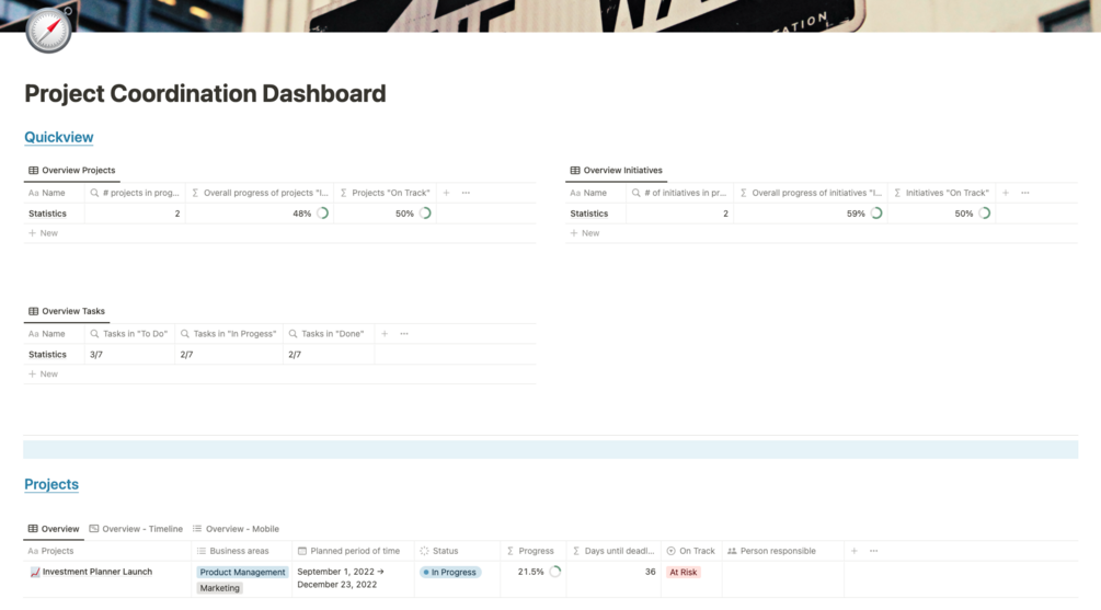 This project coordination dashboard template was created to give the user an easy overview on the diverse projects the user is conducting. It helps to break down a project in initiatives and create smaller tasks to achieve the desired results. Furthermore, it allows an easier creation of relations between project, initiatives and tasks with the help of self-referential filters in order to reduce the number of repetitive linking of related items. Additionally, it is set-up for the asynchronous collaboration of a team or a whole company with the simple linking of people.
